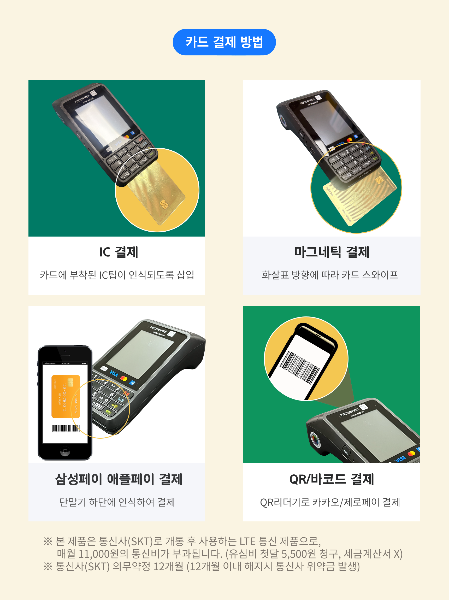 주의사항 1. 본 제품은 일시불 구매상품으로 기본 휴대용 신용카드 결제 단말기를 세팅하여 발송해 드립니다. (장비만 구매는 불가능합니다)